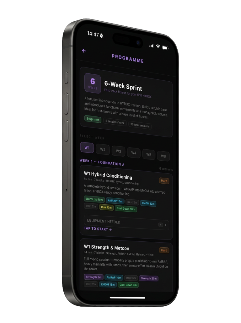 Follow a structured training programme designed specifically for hybrid athletes. Each week builds on the last balancing run sessions, gym work, and full conditioning days. The app selects the right sessions for your schedule and adjusts automatically based on whether you're stronger running or at the stations.