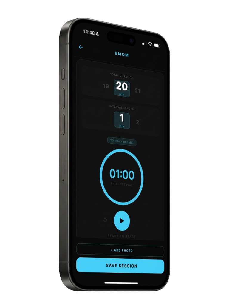 EMOM, AMRAP, Tabata, and interval timers all with voice coaching so your phone can stay in your pocket. Audio cues count you in, call halfway, and tell you when to move. The screen stays on, the music keeps playing, and the session keeps moving.